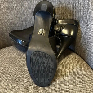 3 inch heel. These were made so your weight is more in your heel than your toes. Had adjustable strap around ankle. Front is like canvas & leather material. Never worn.