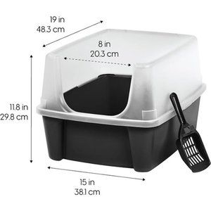 The IRIS Cat Litter Box with Shield and Scoop has extra-tall walls on three sides to help contain litter and spray while keeping dirt out. Open top cat litter container provides quick and easy access, while the deep litter pan design gives your cat a semi-private space. The high-polished interior surfaces and included cat litter scoop make the litter box easy to clean.