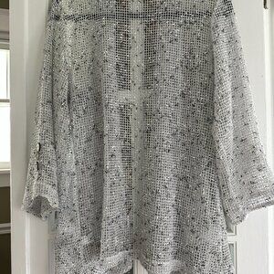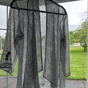 Stylish jacket with slight swing in the bodice. Sleeve ends are asymmetrical with a wide notch just the below three brown speckled buttons. The shawl-like collar flares out toward the bottom. Falls nicely, flattering to your torso. Very pretty, won't keep you warm but it does makes a statement. Like new, worn less than a handful of time. Black accents standout against the grey, white background.
