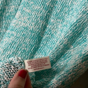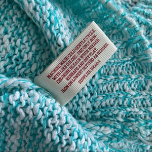 • blue and white, very lightweight open knit cozy sweater with swoop neck — perfect for spring and early fall weather!