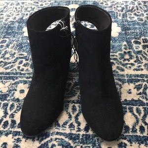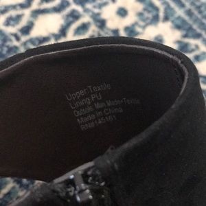 Faux suede material, approximately 3.5 inches. The heel is a walnut color and have a “stacked heel” look.