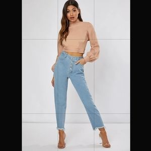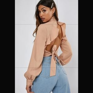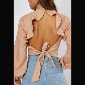 super cute and insane statement back top. In a chic stone hue, high neck and tie back, this crop is a must-have. Team with jeans and heels for the perfect outfit.