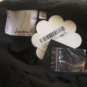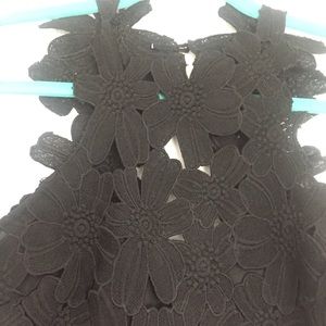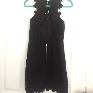 Black dress with open back. Lovely flower detailing. Zipper on lower back is very flattering. Bought for a wedding and ended up not needing it. No trades please, will consider fair offers! Tags still attached with extra button.