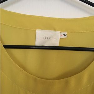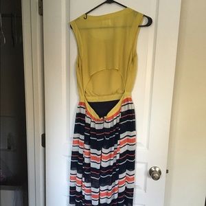Maxi dress with open back made by Lush bought from Fedora! Mustard colored sheer top with navy/pink/white striped bottom. Slip underneath stops mid thigh with sheer overlay and slit up the left side. So cute!