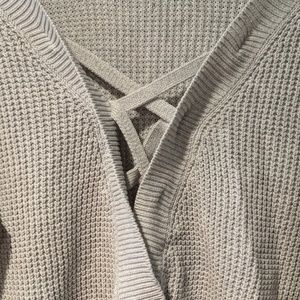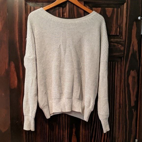 Gray slouchy sweater with open crossed back.