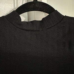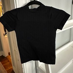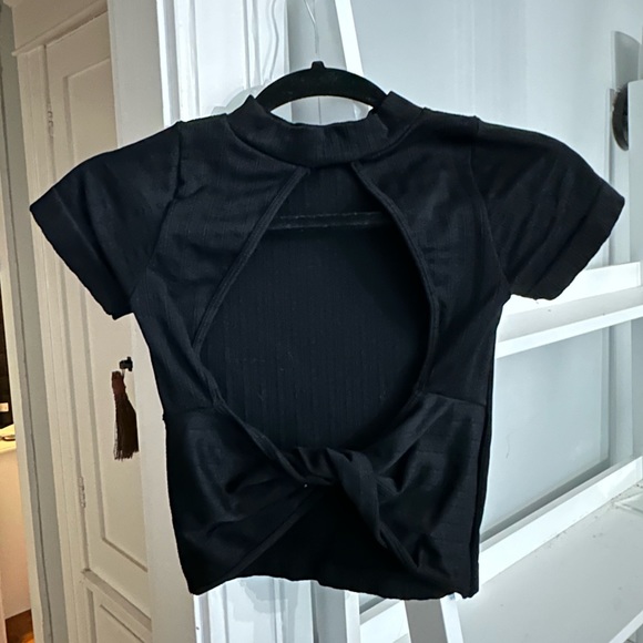 Super cute and stretchy black crop top with open back and tie detailing on bottom, snug fit so no bra is needed, only worn once