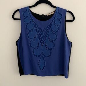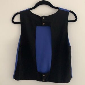 Super cute open back top with stitched detail on the front (blue) and open area with button closure on the back (black). Perfect for a night out! Great condition