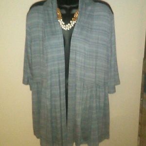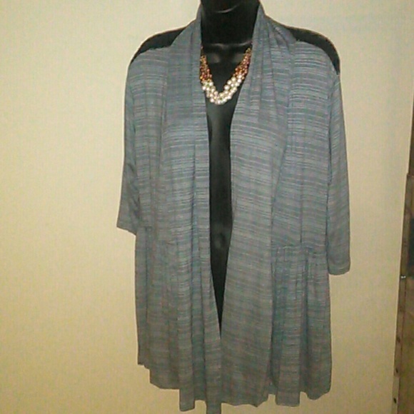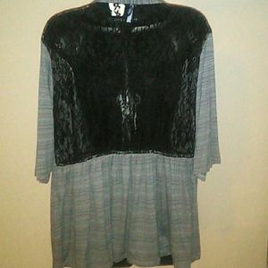 Grey 3/4 sleeve cardigan with black lace inset in the back. Pairs well with leggings, slacks or skirts.