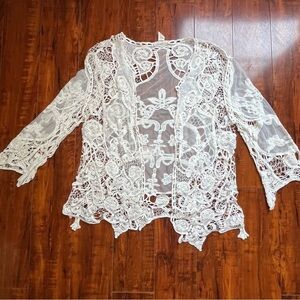 Lace and crochet open-front cardigan. It's the perfect piece to layer with!