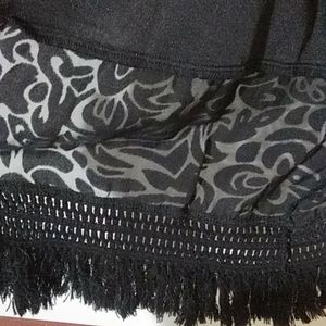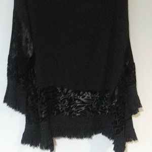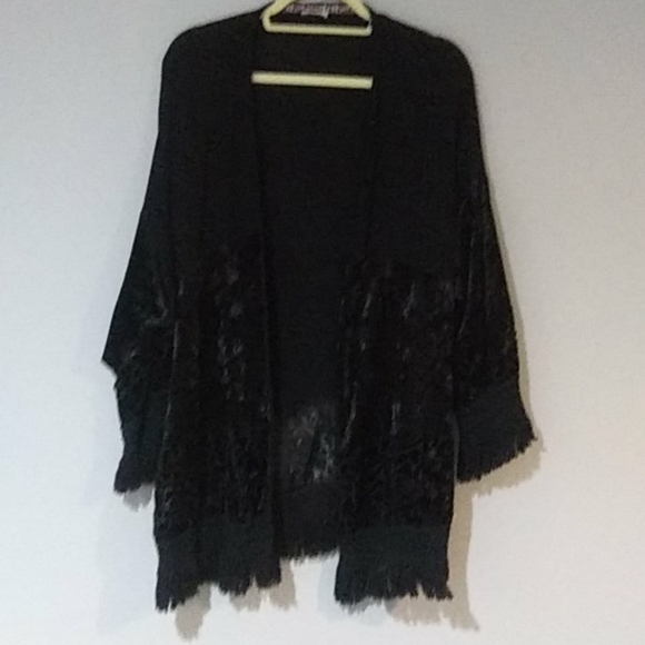 Black mixed material. Open front cover up. Could dress up or down. Fringe on bottom and sleeves. Velvet and sheer print. Upper material more like a soft linen. No tag inside. Would say large to be safe. Fits L-XL. Good condition