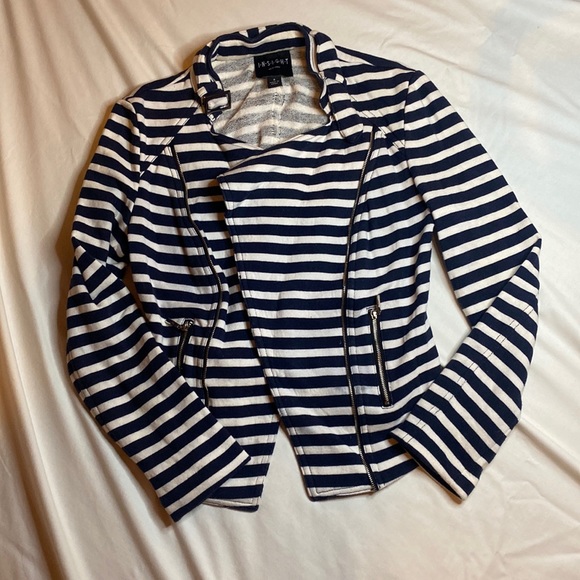 Open, light weight “sweater jacket”, belted detail around the neck, navy & white striped