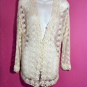 Pit to pit is 20” length is 30”. This is absolutely gorgeous!! Open crochet with roses and pearls. 3/4 sleeves. Has a bit of a sheen to the fabric. Cotton, nylon, poly blend. No size tag. I’d say M/Lg. Has covered buttons
