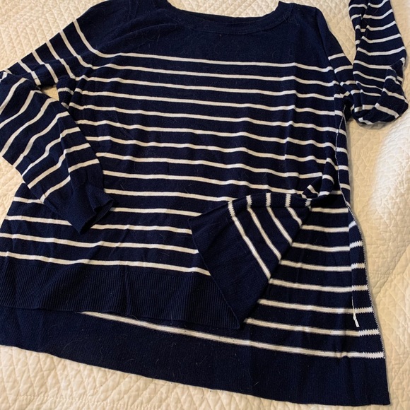 Navy and white striped, open sided sweater on both sides