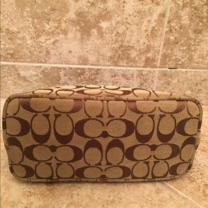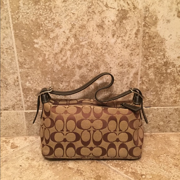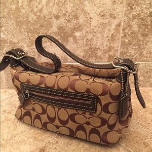 Barely used Signature Coach hand bag. One outside zipper pocket. Adjustable hand strap. One inside zipper change pocket. Height 5 1/2 in. Length 9 in. Adjustable strap up to 21 in. Perfect size bag to hold your most important items!