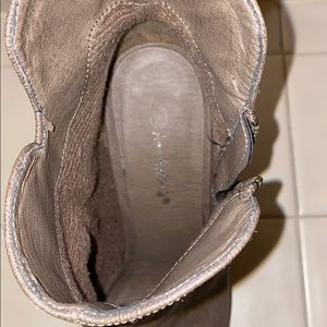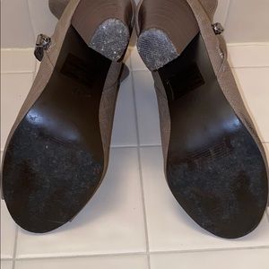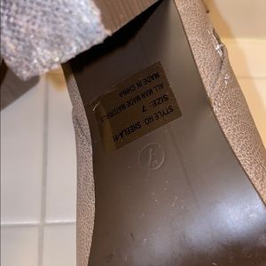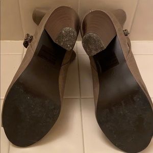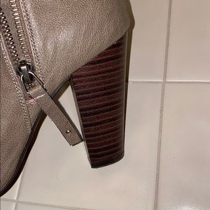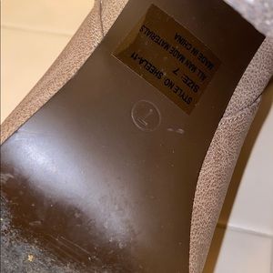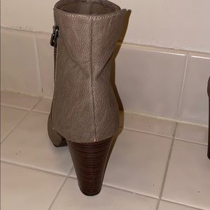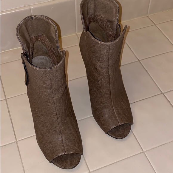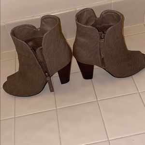 Open toe tan zip booties, size 7, zipper on outer side. Worn a few times and exactly as pictured