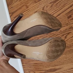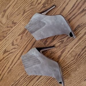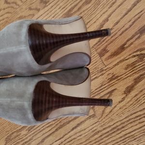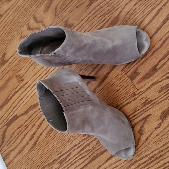 Super comfy taupe (color is a grey/taupe that goes with everything) suede bootie with rubber bottoms for added comfort. Also has elastic on each side opening for easy on/off and snug fit at ankle. Note: right heel had a small gash that has been colored in with wood stain. Can't tell when on but want to mention any noticeable flaws I can see or am aware of.