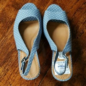 Comfortable Blue and White open toed heels great for any sun dress. Never worn, only tried on in store