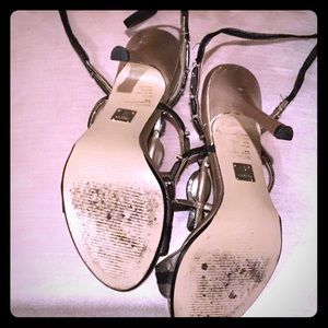 Open toed, lace up high heels from Bakers Shoe Store, black, gold and decorated with pink , light blue , light purple stones. Please request for closer pics. Worn only a few times.