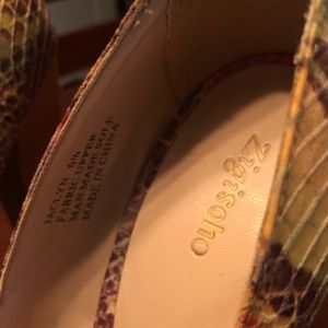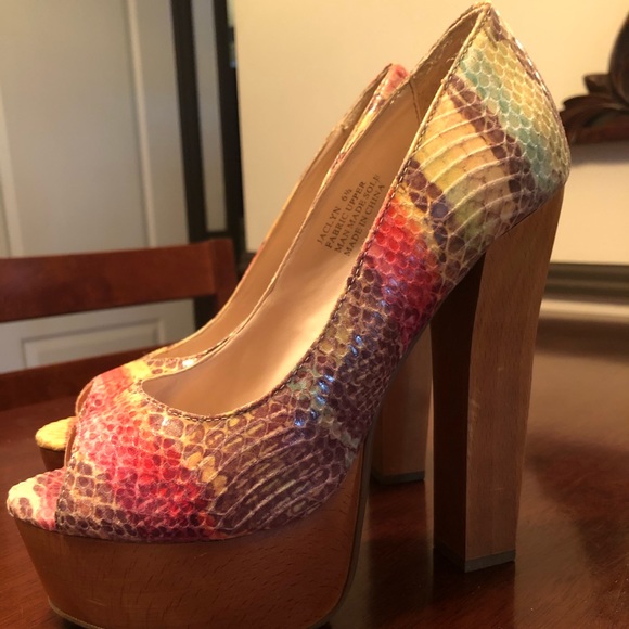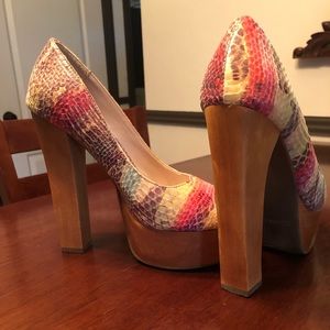The cutest colorful snakeskin heels ever! Size 6.5 by Zigisoho. The heels are about 5.5 inches with platform in the front and are made of wood. Never worn except in the house unfortunately ive never had anywhere to wear them 😢