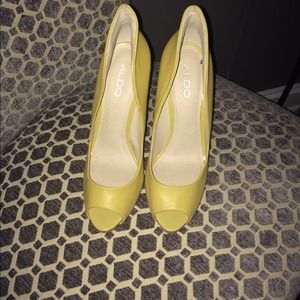 These classy leather open toe pumps can be worn with any color dress during the summer months. The color is a between yellow and green. Very beautiful! Please note these are gently used pumps. The heels are in good condition. There is a small scuff on the right heel.