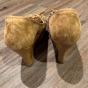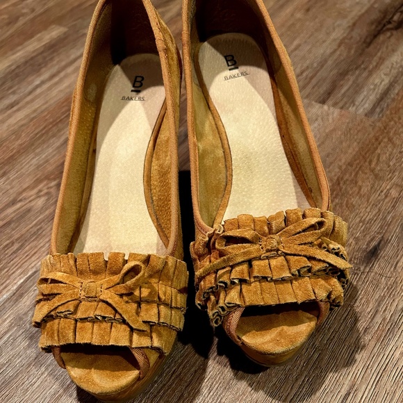 Absolutely adorable camel colored suede peep toe wedges with wood type wedge!