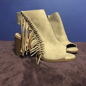 Tan 3.5in heard bootie open toed. Never worn outside.