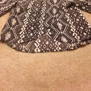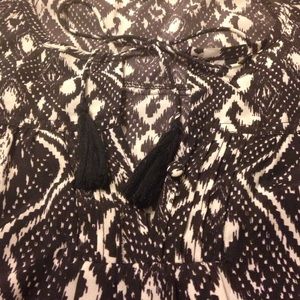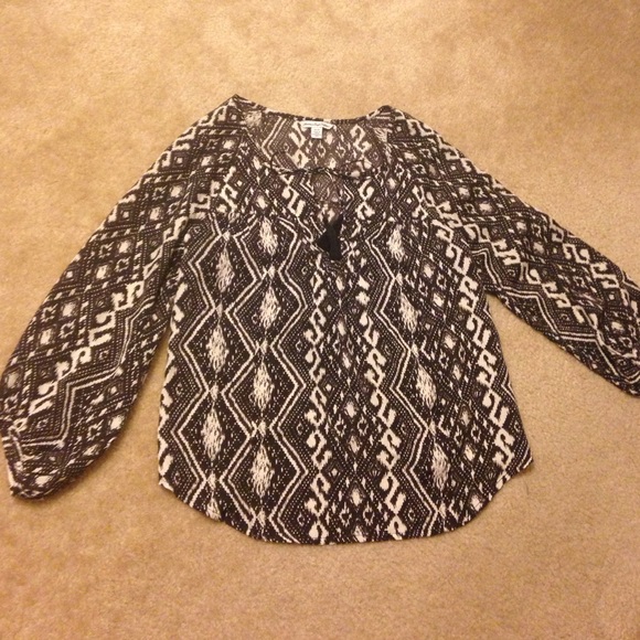 Blouse has a cute bottom butterfly opening in the back :) Tassel-tie closure in front with peek-a-boo oval opening! Cute for any occasion, worn gently. 100% polyester.