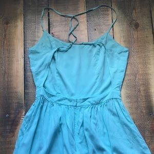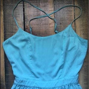 Mint green mini dress. Criss cross in the back with adjustable straps. Opening to the lower back with zipper closure in the middle. Great beach dress!!!