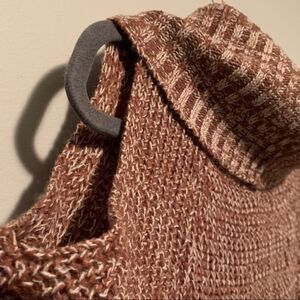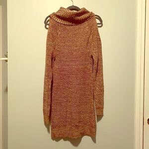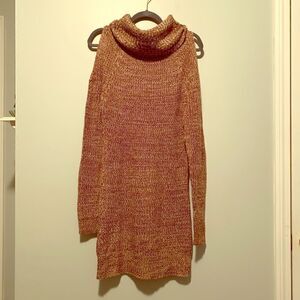Long sweater dress with shoulder cutouts. Dress has a turtleneck and comes down to about the knees.