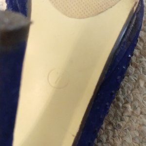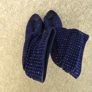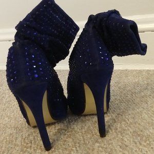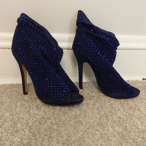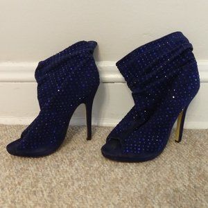 Good condition, fun ankle booties in bright blue. Suede-like fabric covered in matching colored rhinestones. Open toe, stiletto heel and slouchy ankle. Shoes are missing about 15-20 rhinestones between the two shoes, as shown in photo of heel. Not noticeable unless you are very close.