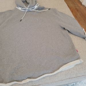 Three-quarter sleeve fleece hoodie Heather grey White elasticized band featuring logo knit White drawstring with black logo Tonal logo embroidered at chest Raw edge at rolled cuffs and hem