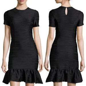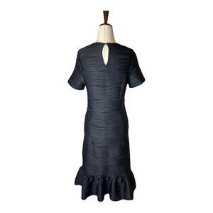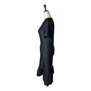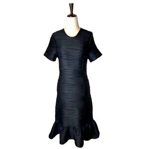 This dress from Opening Ceremony is in excellent condition. It is crafted in a black wavy stripe textured jersey. A signature silhouette for the label, this form fitting style showcases a flared flounced hem. It features; Fitted silhouette, Jewel neck, Contoured seams and darting at the front and back. A buttoned keyhole back, Front and back princess seam, Hidden side zipper closure and is crafted from polyester and spandex.