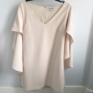 Cascading sleeves lend fluid, romantic movement to an ethereal V-neck sheath dress sewn from lightly textured crepe and cut to hit at mid-thigh. Never worn