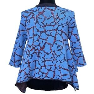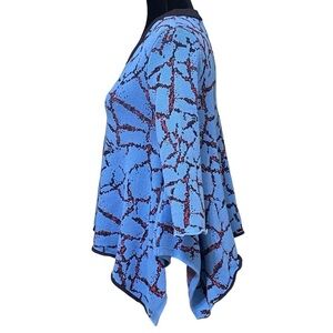 Unique and eye-catching Opening Ceremony sweater top in a blue crackle knit pattern with asymmetric hem and cropped silhouette. Lightweight knit with a relaxed fit and statement style.