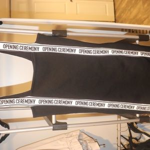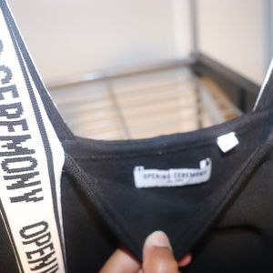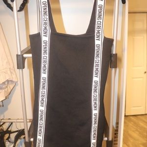Black cotton blend logo stripe bandage dress from opening ceremony featuring shoulder straps, a straight neck and a fitted silhouette.