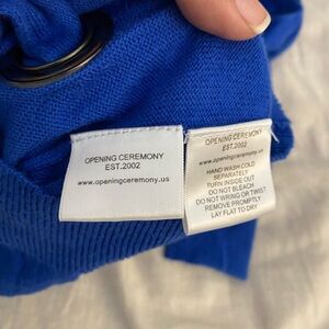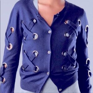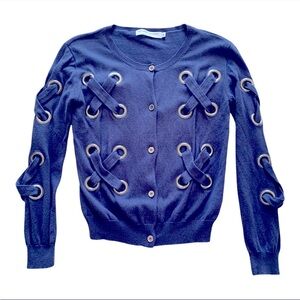 Cool and trendy sweater from Opening Ceremony. Large grommets in front with X pattern. Buckle snap close cardigan. Excellent condition