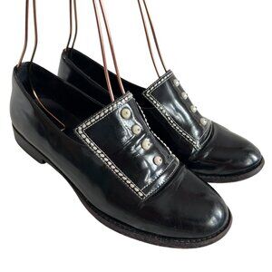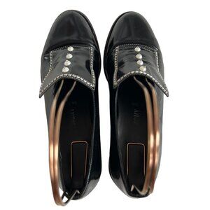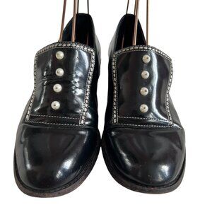 Opening Ceremony Leah Leather Faux Pearl Embellished Loafers, black leather, slip on, faux pearl details, leather lining and soles, round toe, EU 37 / US 7, preowned and shows wear on the soles, creasing and scuffing - see photos