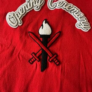 Slouchy poinsettia red oversized cotton-blend cardigan from Opening Ceremony. Logo appliques and patches. Size M, could fit L.