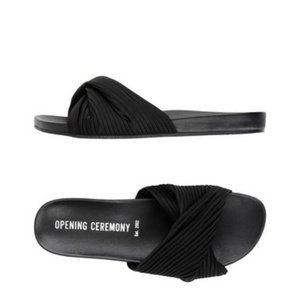 A twisted, finely pleated knit slide strap highlights an easy sandal for a vibe that's both casual and luxe.