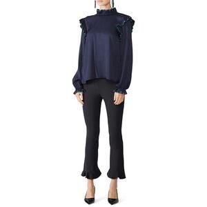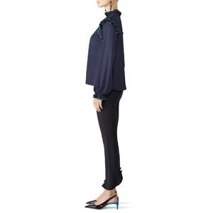 Opening Ceremony Persian Blue Twill Ruffle Trim Blouse in Navy. Size 2. Features high neck, long sleeves, ruffle trims, and hidden back button closure. 53% Viscose, 47% Rayon. Excellent condition, no flaws.