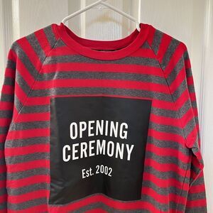 Opening Ceremony Red and Gray Striped Crewneck Sweatshirt Women's Size Medium. This is a lightweight sweatshirt, almost like a thick top in my opinion. Logo graphic print on the front and also on the back, but the back is backwards. I think this is a women's piece, but am not positive? Has been worn and washed, and the second "E" in Ceremony on the front has two small black marks on it - please see the pictures. Good Used Condition.