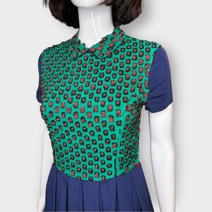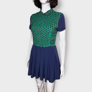 Silk navy & green short sleeve dress, with pleated skater style skirt bottom