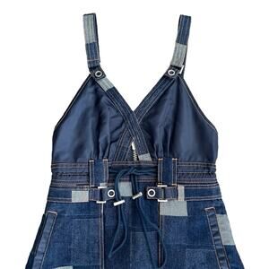 Tags- patchwork dress, streetwear style, avant garde style, artsy girl style, artsy aesthetic, fashion school outfit, opening ceremony rare styles, dresses to layer with long sleeves, denim dresses mini dress patchwork, quiet luxury, designer denim, opening ceremony women’s patchwork navy multi denim jeans strappy cutout mini dress
