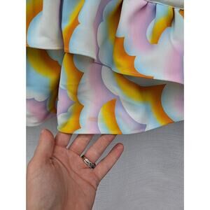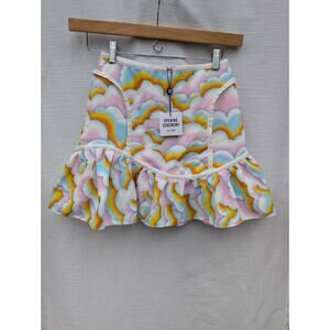 Opening Ceremony Womens Printed Scuba Ruffle mini Skirt Sz 2 Pale Pink Festival. Skirt is new with tags but does have an imperfection. See up close photo of flaw. Due to the busyness of the pattern, flaw is hard to notice when worn. Skirt originally retailed for 325$