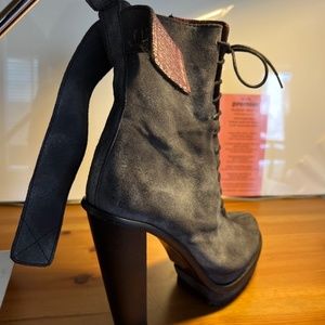 Gray suede/leather boots. Size 10 . This is a very sturdy well made shoe. I Would not be selling if my foot could handle the height but I can’t walk very far in heels like these anymore. Brilliant shoe with a burgundy color on the inside . If you have any questions please ask.also 5 in heel 1.5 platform. Lugg sole.