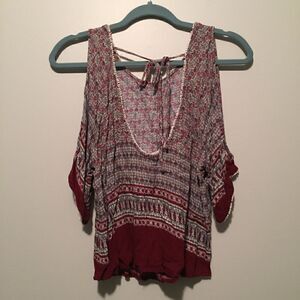 Wine and blue printed top. Floral prints and small pom poms on the sleeves. Bow in the back.