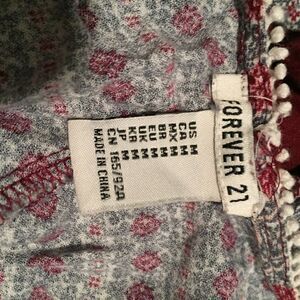Wine and blue printed top. Floral prints and small pom poms on the sleeves. Bow in the back.