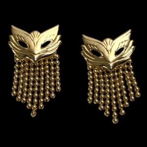 Opera Fox Masquerade Mask Waterfall Gold Tone Earrings 1.5"