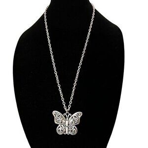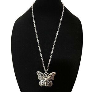 Opera Necklace Silver Tone Chain Butterfly Pendant 28 in