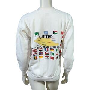This vintage Operation Desert Shield sweatshirt is a unique piece, featuring a design that captures the essence of this historic military operation. The sweatshirt is a medium size and offers a comfortable fit, but it does have some yellowing stains that will require either dyeing or bleaching to restore its full potential.
